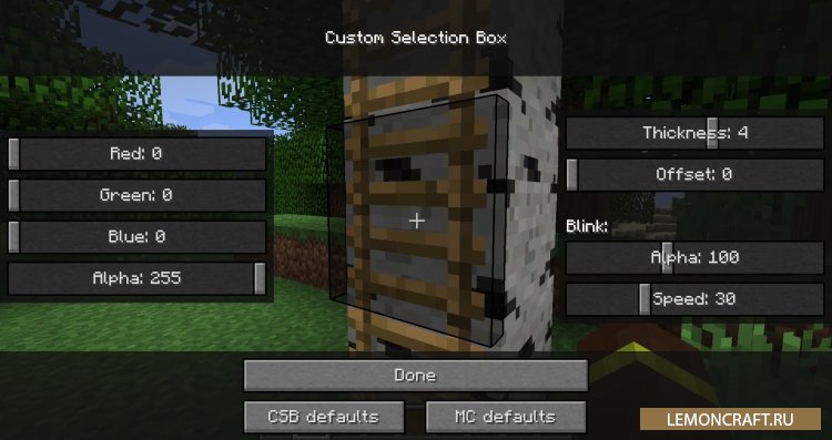 Мод на настраиваемую рамку блоков Custom Selection Box позволит вам полностью настроить рамку, которая появляется при наведении курсора мыши на какой либо из блоков. В настройках мода вы сможете изменить цвет рамки, а так же время задержки этой рамки. Для того, что бы попасть в настройки вам нужно зайти в настройки игры и найти кнопку Custom Selection Box.